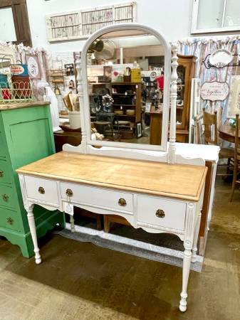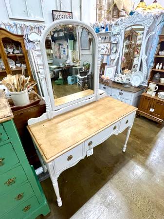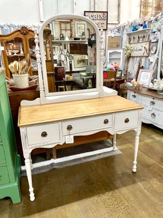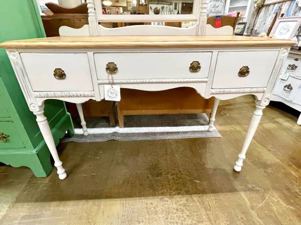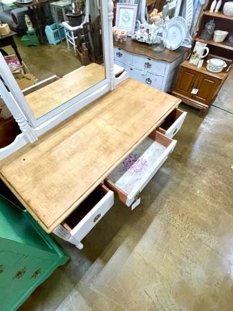This beautifully painted, distressed, stained, and sealed piece doubles as a charming vanity or stylish entryway table. With its drawers working smoothly and lined for added functionality, it's perfect for storing essentials. Plus, it's versatile enough to be repurposed as a desk if the mirror is removed and hung separately.