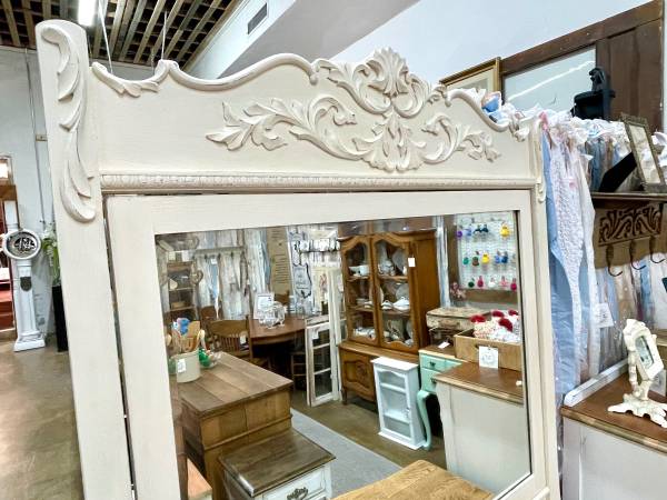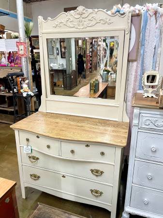 A beautiful cream-colored dresser, adorned with 4 well-working lined drawers. The top has been sanded and sealed, adding a touch of elegance to this classic piece. The matching mirror completes the look, providing a stunning focal point for any room.