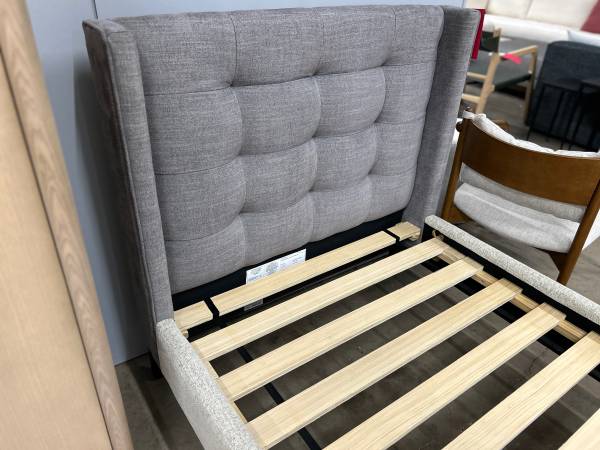 Subtle, modern elegance. A low, tufted headboard in a fashion-forward grey pairs with a simple, modern iron base.