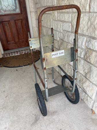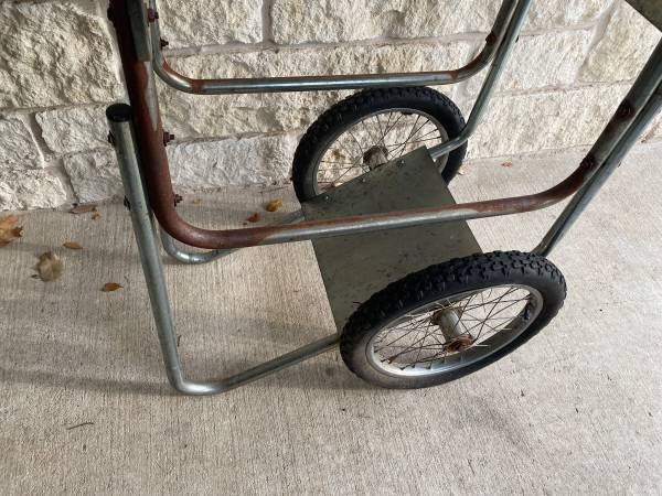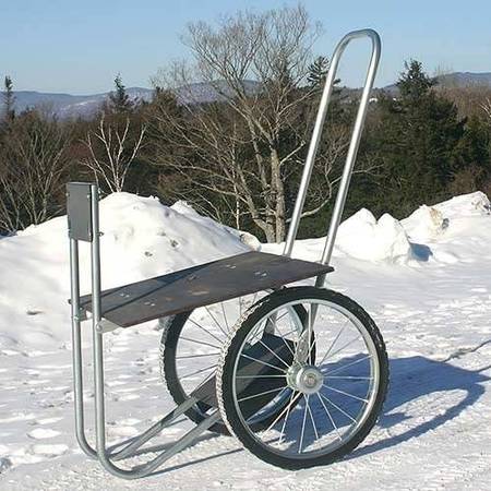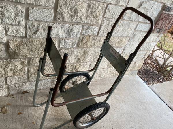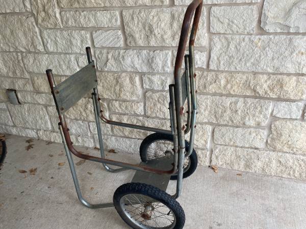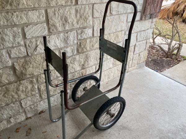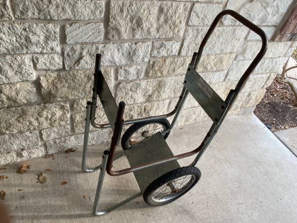 Big Wheel firewood log cart. One of the wheel is bent but still functional. These are not the actual pictures but similar without the board. Similar cart sells for about $239.00 to $309.00 online...