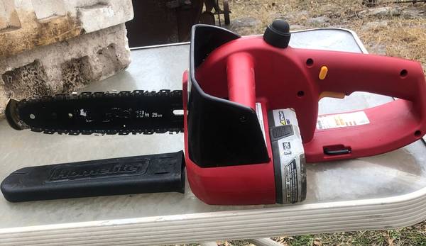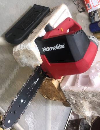 4. Chainsaw Homelite UT-34010 18 Volt Cordless 10" Chainsaw. uses the commonly found 18v Ryobi/Homelite battery pack. Used twice for some light tree pruning. Includes blade cover, original owner's manual, styrofoam case, battery does not hold a charge very long and needs to be replaced. It's light weight makes it an ideal for "in the tree" prunner and one hand operation. $25.00 or best offer.
