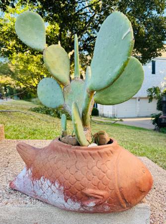 Large fish-shaped terracotta planter with thornless nopales Measures 10” high and 21” long $175 plus #cactus pads you’d like to keep at $5/pad.