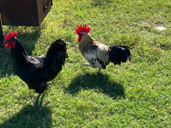 Too many roosters! For sale Spanish cockeroo’s, barrred rocks, solid black, solid orange—- $20 each. Also 6 month old mixed roosters, $10-15 each. All healthy, all free range! No hens for sale!