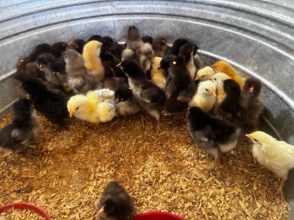 Barnyard mixed chicks with green egg layers, black sex links, chocolate Orpington, and more. Make me an offer for all.