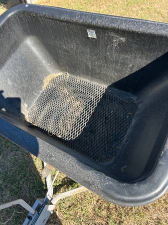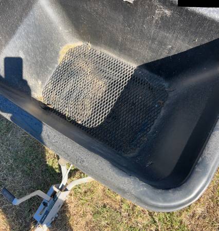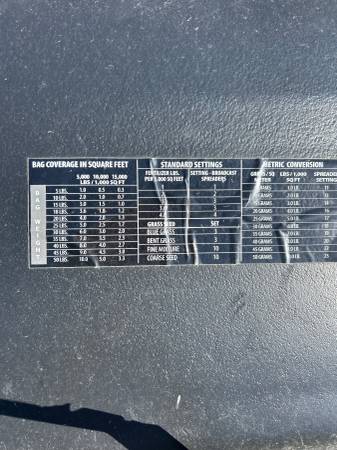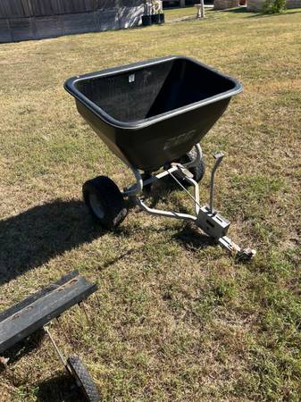 Tow-behind fertilizer spreader. Broadcast spreader , holds about 130 Pounds of fertilizer