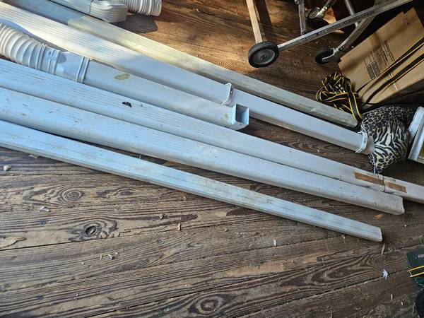 This is a set of only slightly used Gutter parts. Some is PVC, some Aluminum. I was trying to add a water collection system to my gutters and it ended up not working out, but most of this stuff is new. I AM FIRM ON THE PRICE, SO PLEASE DON'T EVEN ASK! If you know anything about the cost of this stuff, you know that its far below cost. five one 2 eight 48 seven 462