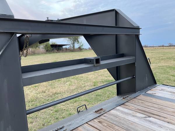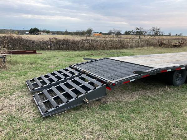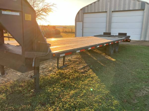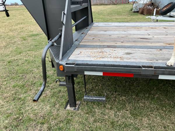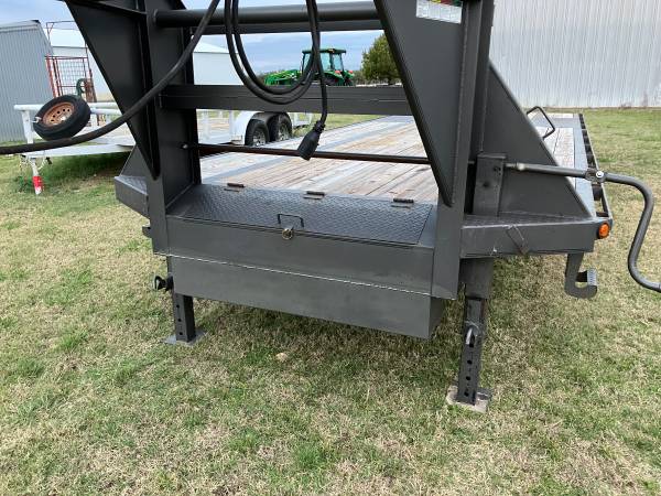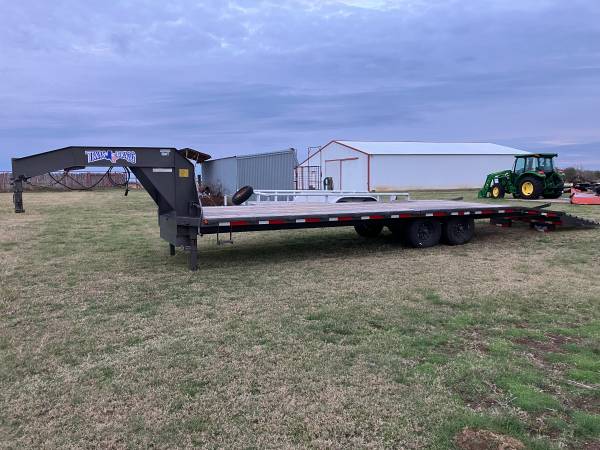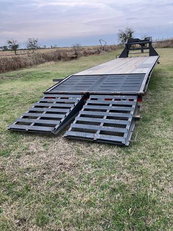 2021 Flat Bed Gooseneck trailer. Mfr. Texas Bragg, 24’ w/5’ramps 29’ overall, 7k axles, dove tail with fold over mega ramps, over size chain box, side steps both sides, LED lights, 2” receiver between uprights for winch. Tires and trailer in very good condition. Title in hand, ready to roll.