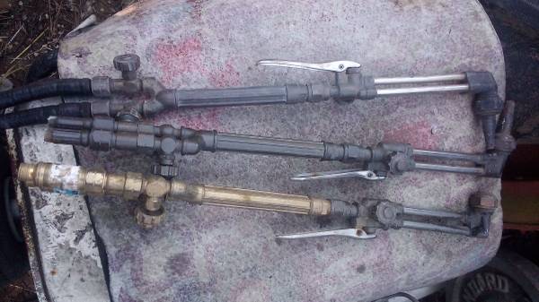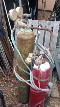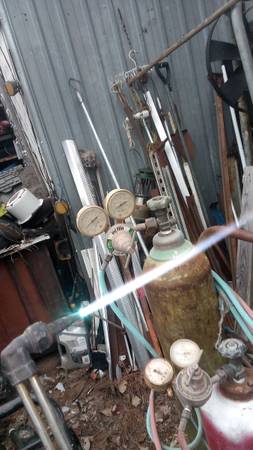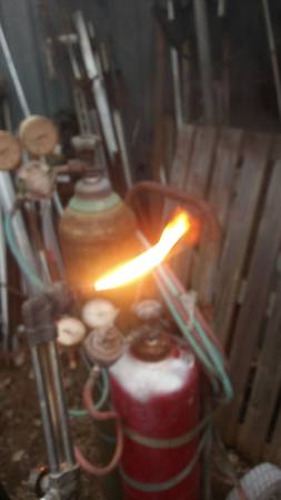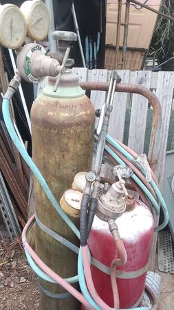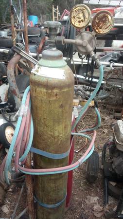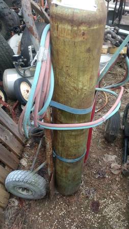 4 torch heads 25 ft hoses gauges and large oxygen bottle medium acetalyne bottle on cart $300