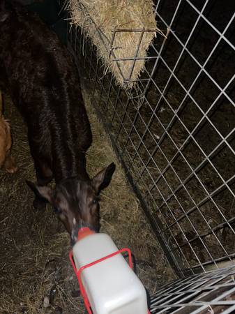 1 black angus bull calf starting to eat feed along with bottle about 8 weeks old 1300$