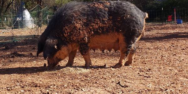 Our boar is blonde and throws blonde pigs. Sow is swallow bellied. Our stock was shipped from different states seeking out the best quality. I only buy quality stock, and strive to breed and keep the same quality. Mangalitsa's can cross with any breed you have to improve meat quality.