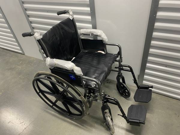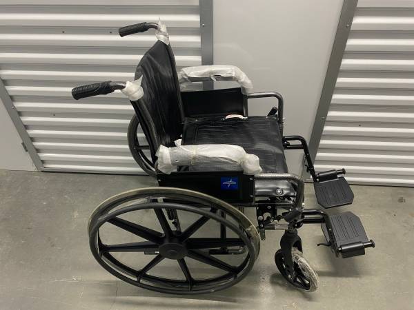 New Medline wheelchair with 18"W seat, removeable desk-length arms and swing-away leg rests.