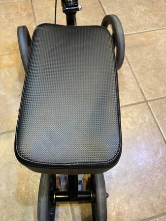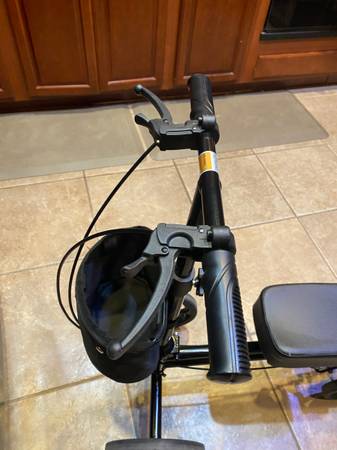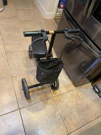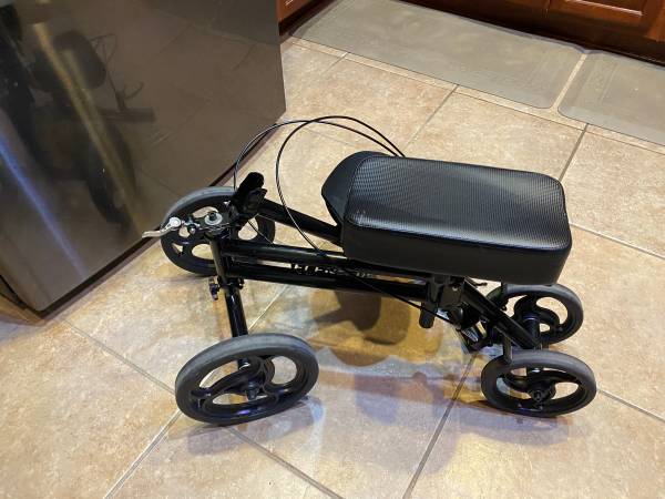 Knee walker with lockable brakes. It folds for easy storage and transport.