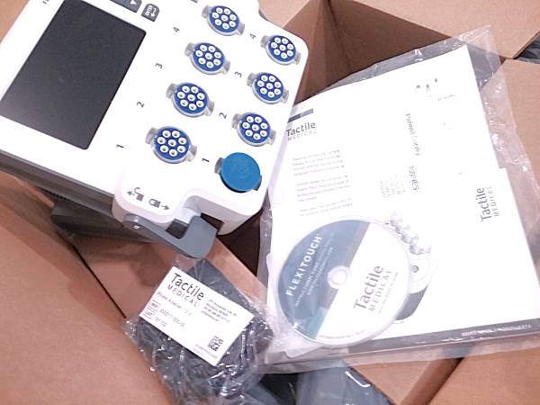 Tactile Medical Flexitouch Plus PD32-G3 compression therapy device includes 3 new garments all never used still factory sealed in plastic: truck size medium, right full leg size medium, left full leg size medium, user guide, instructional video, power adapter.