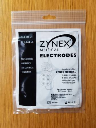 Zynex Electrodes 30 Packs of 4 Electrode 2" Round There's 30 packages of 4 Electrodes (120 Electrodes total). They're new and sealed, with a 2023 expiration date. Thanks! NexWave Electrode