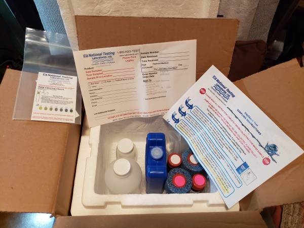 Includes: all the supplies needed to send a water sample to be tested, instructions, and a total chlorine check kit. The testing kit will need to be mailed to the lab, and the instructions indicate that reduced shipping costs are available through the lab.