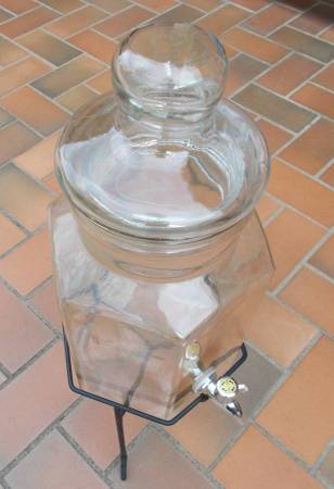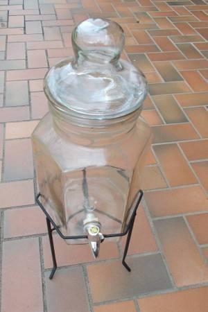 TALL Glass Tea/Lemonade or Water Container on metal stand. THE GLASS IS 15 1/4" TO THE TOP OF THE LID IT IS ABOUT 8" IN DIAMETER WHEN ON THE STAND, IT IS 22 1/2" TALL Heavy duty glass with spigot....