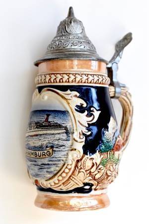 Vintage 1960s 1969 RARE 7" Hand-Painted Pewter Lid Lidded German T.S. Hamburg Ocean Liner Ship Stein Beer Mug