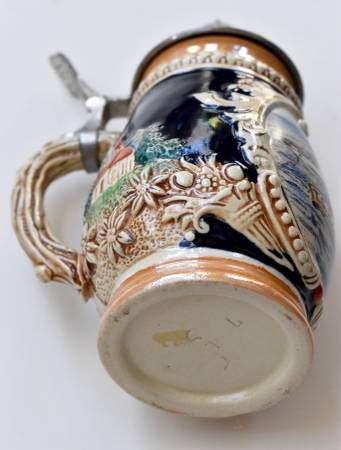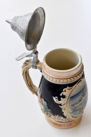 * DESCRIPTION: Features branch-style handle (numbered under handle) & pewter lid. European Germany Barware.
