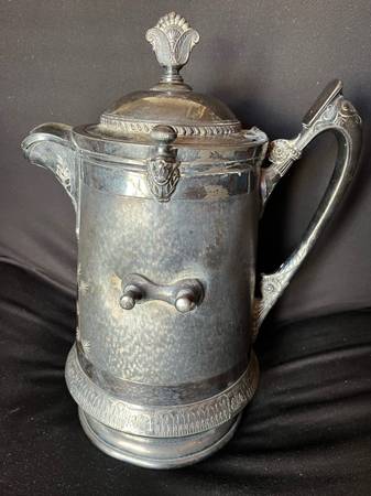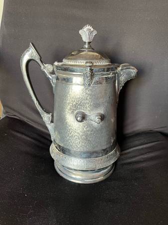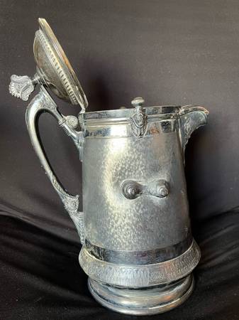 This is an antique silver-plated water pitcher/coffee pot made by Reed & Barton, likely from the late 19th century. The pitcher is a tilting, thermal-lined design, which was common for the period to keep water cold and coffee hot. It features a detailed design with a hinged lid.
