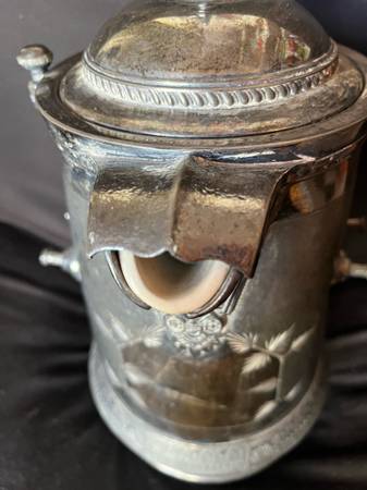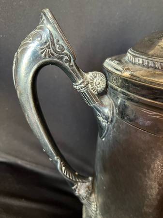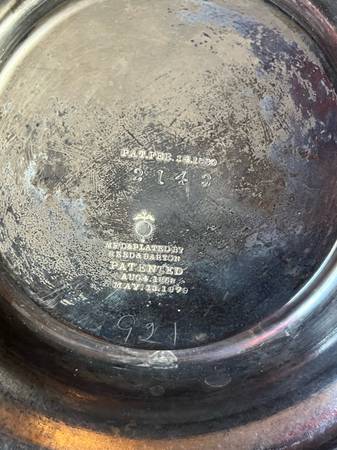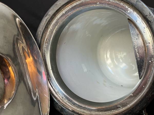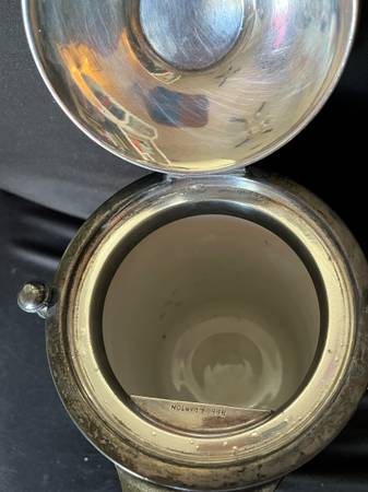 There is some patina that can be cleaned with silver polish and it also has some dents in the lid and side. Weighs around 7 pounds.