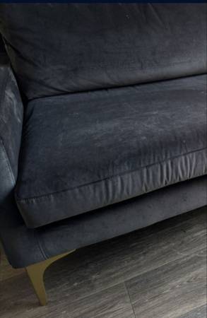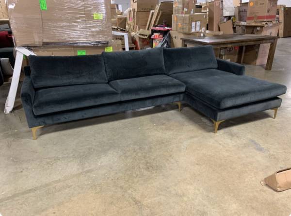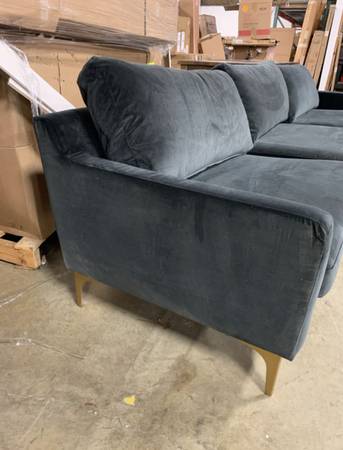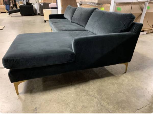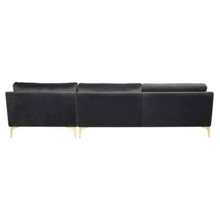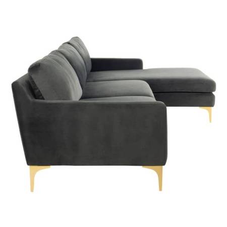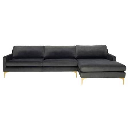 A perfect pairing of minimal lines while still conveying luxurious style, this contemporary chaise sectional sofa updates any living room. Designed with velvet upholstery in a soothing dark grey, it complements any décor. Its modern gold legs add an elegant sculptural touch.