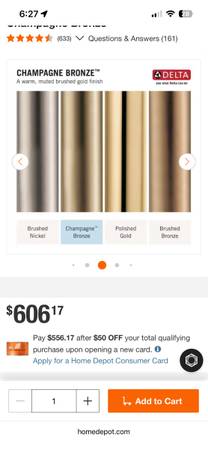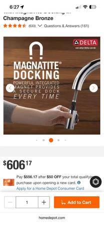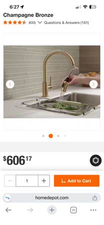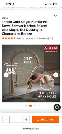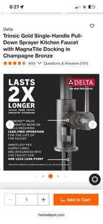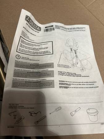 Brand new in box Trinsic by Delta Gokdbsingke handle faucet. List price is $998, on sale everywhere from $608-$700 or so. Save a hundred bucks and buy mine. Never been hooked up, just sitting in my garage. Bought from a construction friend who had an extra from a job and sold it to me for $500, back when they were $799. It’s worth saving yourself the extra hundred!