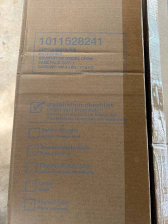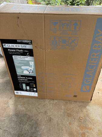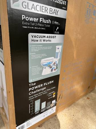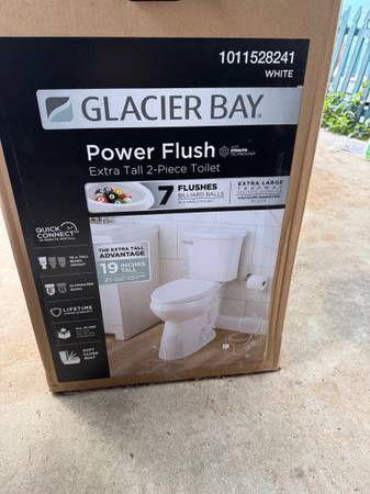 New in box. Glacier Bay Power Flush extra tall 19” two-piece toilet with elongated seat. New inbox. Installed but decided it was too tall for us and re-boxed. Includes soft close seat....