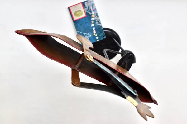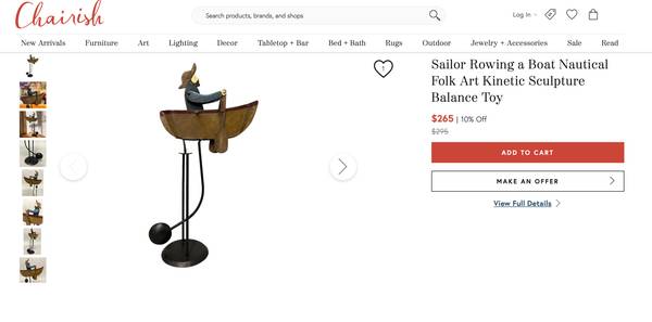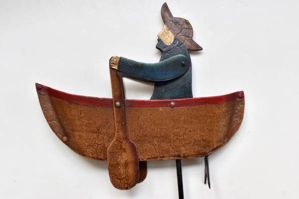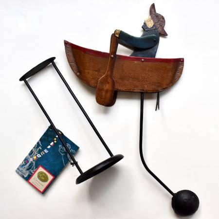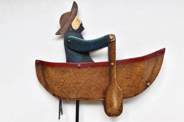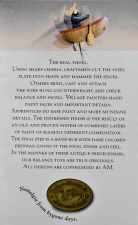 * DESCRIPTION: This active little skipper seems to row against the tide. Hand cut from heavy sheet metal, hand painted in richly crackled, distressed paint. Using sharp chisels, craftsmen cut the steel plate into shape and hammer the edges. Others bend, cast and attach the wire hung counterweight and check balance and swing. Village painters hand paint faces and important details. The distressed finish is the result of an old and proven system of combined layers of paint of slightly different composition. The final step is a hand rub with dark colored beeswax giving it the final finish and feel. In the manner of their antique predecessors, each balance toy is a true ORIGINAL. A joy for kids and adults alike.
