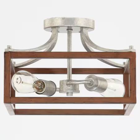Upgrade your home's lighting with this Hampton Bay Boswell Quarter 2-Light Flush Mount fixture. The open-cage design has a rustic appeal that's perfect for living rooms and dining rooms. The galvanized finish and painted chestnut wood detail create a stylish focal point for any room.