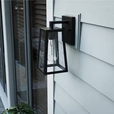 Make a subtle statement with this simplistic, yet stylish modern wall lantern. Perfect for use outdoors to illuminate your entryway, this geometric beauty shows that simple, minimalist design can make a statement all its own. Clear seeded glass shades and a warm black finished powder coated steel add a hint of texture to the otherwise clean-lined piece, allowing the bright light of the bulb to flow unrestricted to welcome your guests to your charmingly contemporary home with a warm cascade of light.
