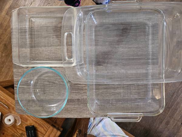 We have almost every size of Pyrex made, from 8"x 8" to 2-4quart baking dishes to pie pans. Some are the easy grab style. Also mixing bowls. Starting at $10 for the small mixing bowl and up. Or make...