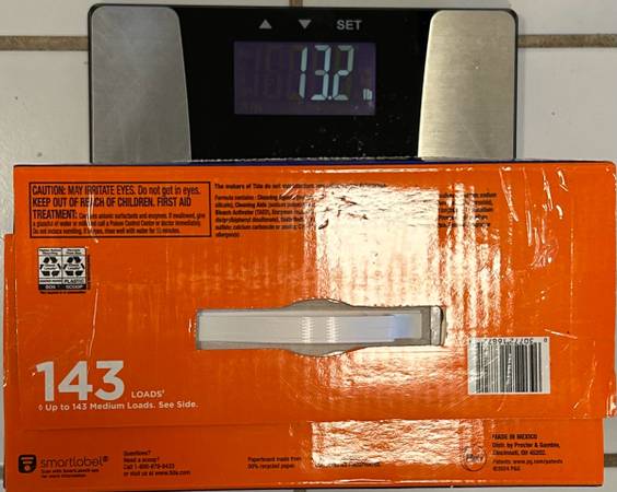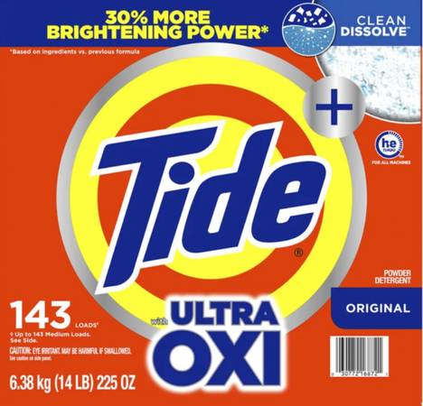 Here we have a 14 lb. box of Tide Plus Ultra Oxi Laundry Detergent, Original, 143 Loads, 14 lbs., still holding 13.2 lbs!