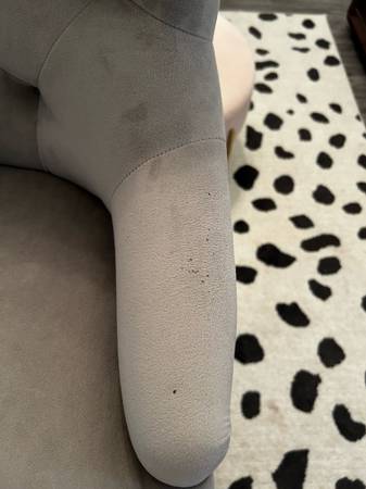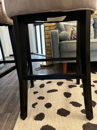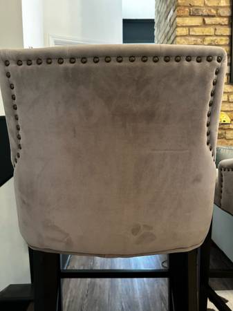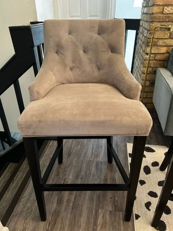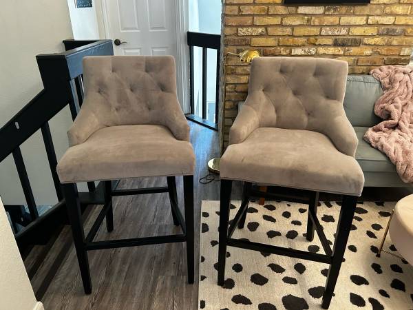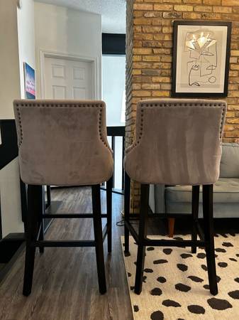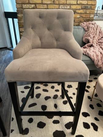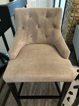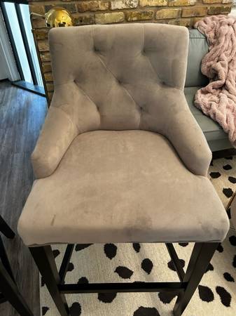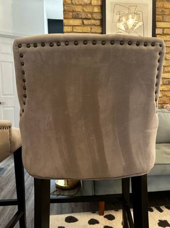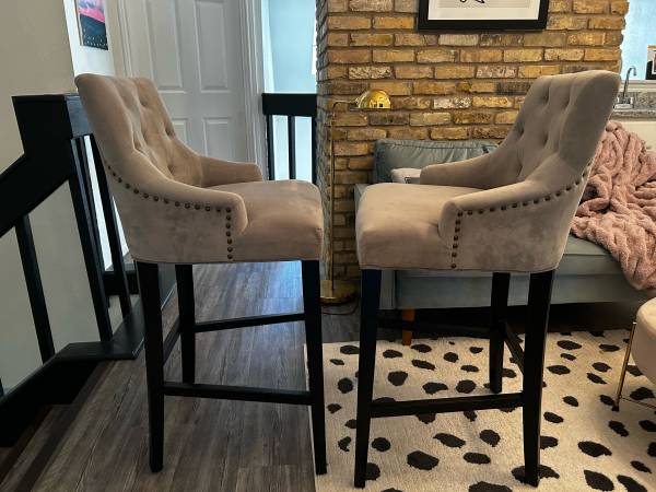 Beautiful set of velvet/suede like material bar stools. Barely used. They are in almost perfect condition. One of the arms of the stool has scratches or demarcations on it, and I believe I bought it that way because it was the last one left. These have been sitting in my house not being used because I don’t have a bar anymore.
