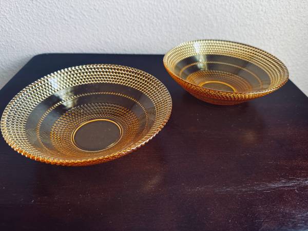 Vintage amber, beaded glass bowls (2) measure 6.5" wide, 2" tall. No chips or cracks.