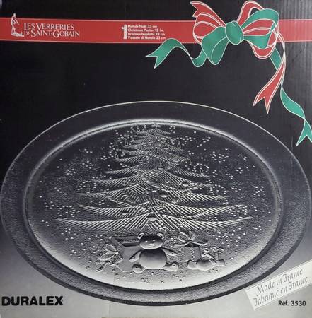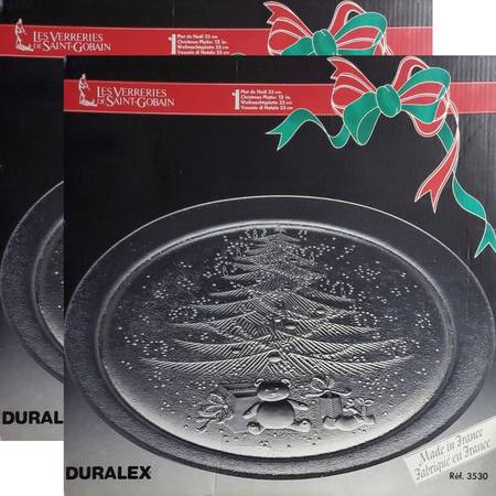 Vintage SET of 2 Christmas Holiday Tree Clear Glass Large Round Serving Platters Platter Trays Tray Plate Plates