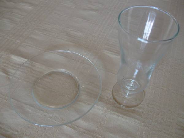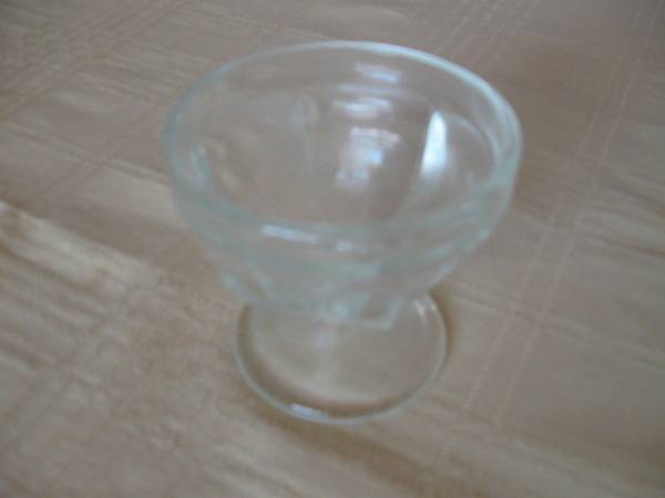 Set of 8 glass dessert cups and 8 glass saucers/plates. Cups are 7" tall, 7 ounces each. Saucers are 7" wide. Great for sundaes and milkshakes or just plain ice cream, with cake or cookies on the side. $15. Storage box included.