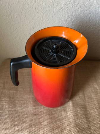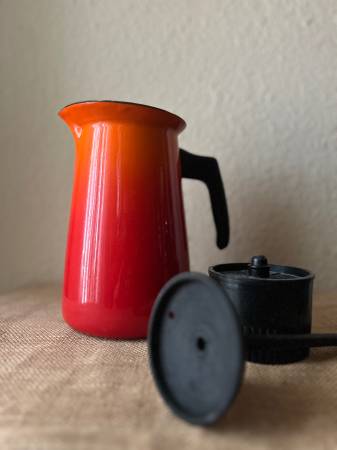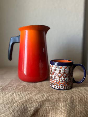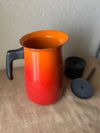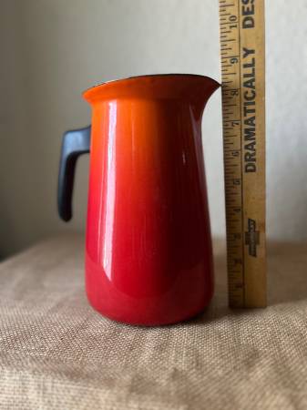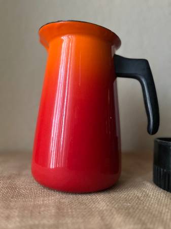For sale is a stunning vintage mid century enamelware coffee/tea pitcher in the sought after flame orange color. Kind of a ombré color of red and orange. Heavy enamel with out chips or cracking. Excellent condition, would be a nice addition to your other vintage enamelware pieces like le crueset.