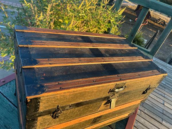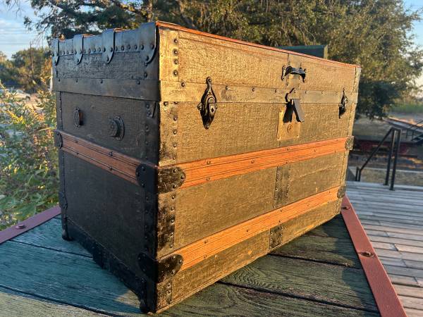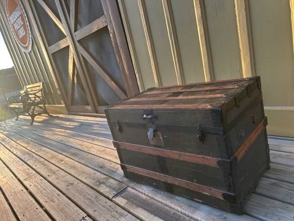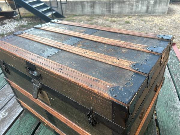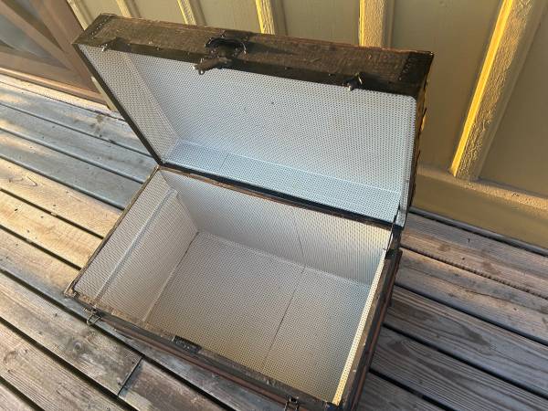 For sale is a absolutely stunning antique steamer chest. It has just the right amount of patina on it while still being in amazing condition. Great decor piece to put hideaway blankets or games in. Would look amazing as a table with glass top or as is. The greens, browns, and black in this chest with pair well with a variety of decor especially brass accents. The inside of chest has been refinished with a nice wallpaper so no stinky antique smells or issues to worry about. This piece is ready to go. Measures: 30in long, 17.5in wide, 20in tall