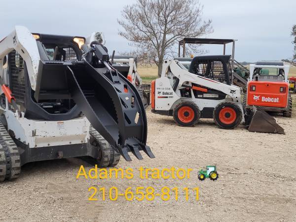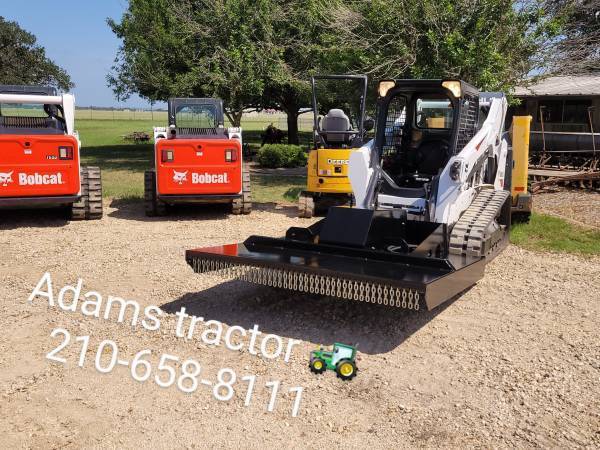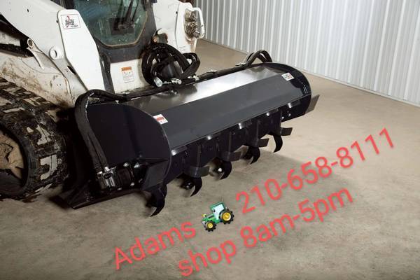 Bobcat Skid steers, buckets, forks, grapples, blank attachment plates, augers, trenchers, backhoe attachments, brooms, concrete buckets, hay spears, trailer hitch movers for skid steers, tires, tires and wheels, foam filled tires, rubber tracks, rock buckets, skeleton buckets, teeth buckets, smooth buckets, rotary tillers, angle brooms, pick up brooms, forestry mulchers, tree shears, tree pullers, post pullers, brush cutters, rotary mowers, brush shark attachments, augers, auger bits, rock bits, auger extensions, stump planers, post drivers,