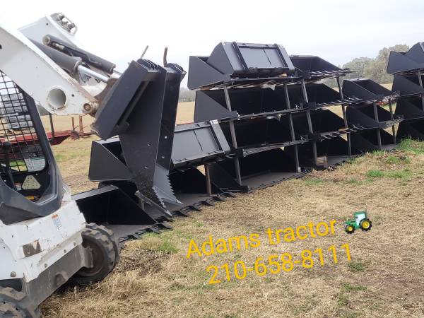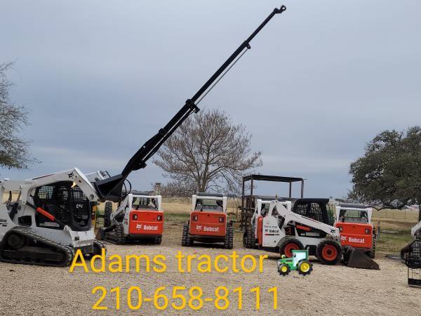 Bobcat Skid steers, buckets, forks, grapples, blank attachment plates, augers, trenchers, backhoe attachments, brooms, concrete buckets, hay spears, trailer hitch movers for skid steers, tires, tires and wheels, foam filled tires, rubber tracks, rock buckets, skeleton buckets, teeth buckets, smooth buckets, rotary tillers, angle brooms, pick up brooms, forestry mulchers, tree shears, tree pullers, post pullers, brush cutters, rotary mowers, brush shark attachments, augers, auger bits, rock bits, auger extensions, stump planers, post drivers,