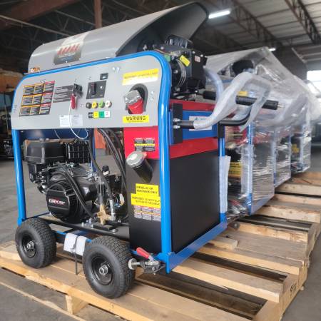 BRAND NEW INDUSTRIAL RCPCE 4.0 GPM 4000 PSI HOT WATER PRESSURE WASHER. CRX-420 Engines, These units have Industrial UDOR GEARBOX pumps. Will draw from a tank just like a belt drive pump/unit. NOT DIRECT DRIVE!!!!! Full manufacturers warranties apply. Will come with gun, lance, tips and 50' hp hose. On pallet just like in picture. Picked up at our shop. Retail is over $11,000.00 $6,495 Plus Tax