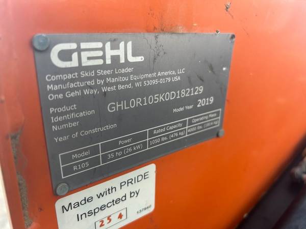 Enter this link to see more images plus all other inventory we have available: https://lyv.cc/YN6LR2019 Gehl R105 Rubber Tire Open Cab Skid Steer Loader 35Hp T Handle