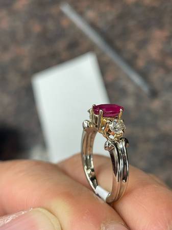 14k Gold Ring with red stone, has 2-15 point round diamonds. Total carat weight is .30 points. Weights 3.6 grams and is size 4.5. Price is negotiable. Cash or card payment accepted only. Let me know if you’re interested. My name is Christian (Hablo Espanol)