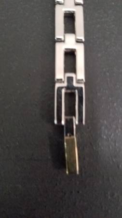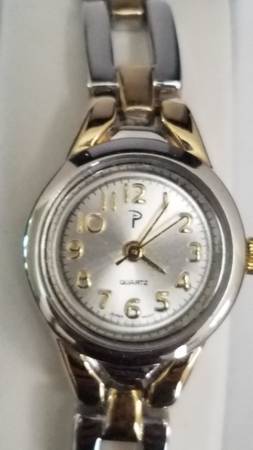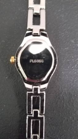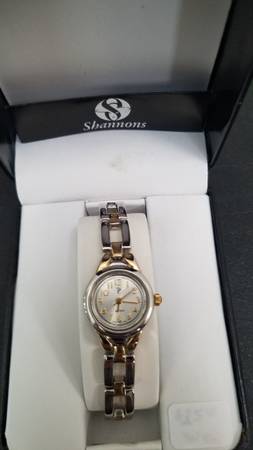 This is a ladies quarts dress watch made by "Shannon". It is silver in color with gold accents. The band has a chain look and has an extra link for larger wrists. The battery was replaced recently....