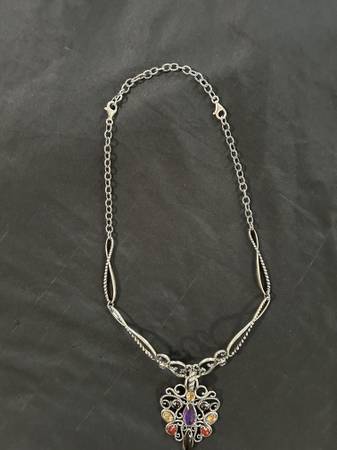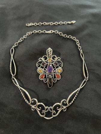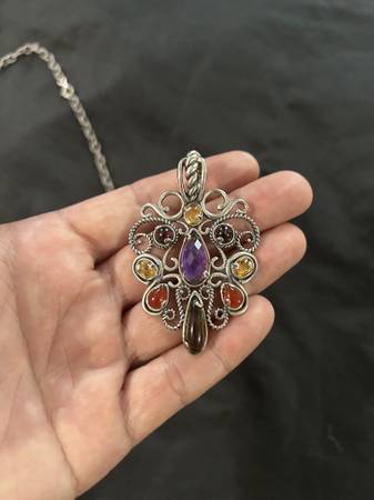 The pendant is stunning and reminds me of an owl face. It has amethyst, garnets, and other gemstones. It also has a latch hood that makes it a snap to take on and off this necklace or any other necklace.