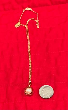 The pearl rests in a gold-tone “basket” w/decorative bail.