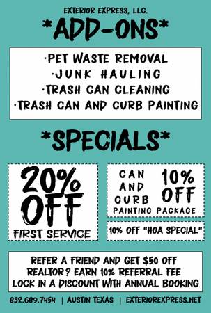 Roof Wash, Gutter Clearing, House Washing, Debris Removal, Window Washing, Pressure Washing, Trashcan Cleaning, Trailer Washout, Carwash, Junk Haul, Pet Waste Removal, Poison Ivy/Oak Removal, Minor Tree Trimming, And More! Call now for a free immediate quote