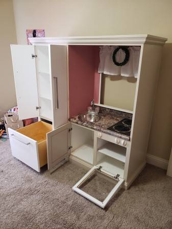 Play kitchen converted from oak TV cabinet. Very cool for child.