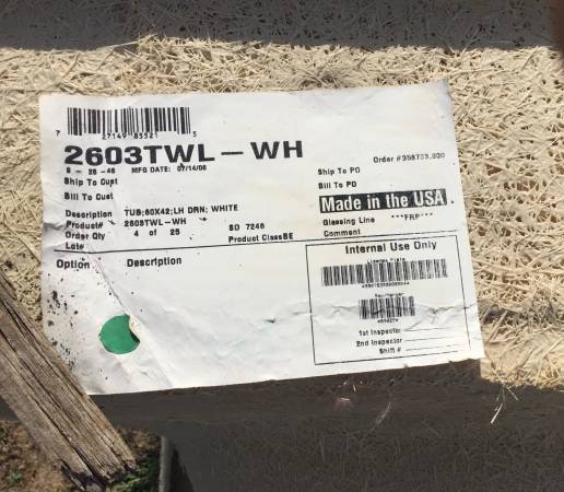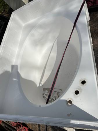 White Oval fiberglass bathtub 5' x 43" x 15β deep. With the wall surround itβs 27β tall, including the flange. It has a left side drain. Front side has a hole in the βtileβ but could be covered by sheet rock or tile, or cut it out and put a decorative tile in that space. No other issues. The photo of the underneath side is just giving a view of that for you.