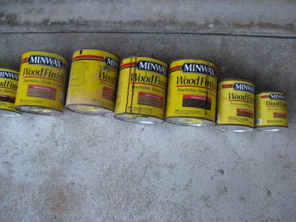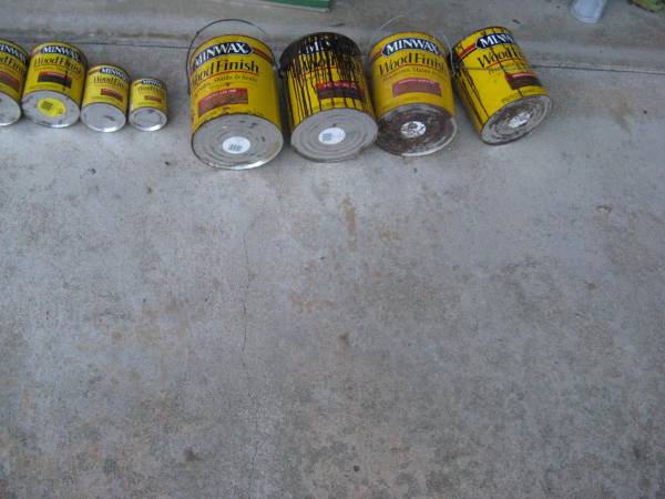 MINWAX WOOD FINISH - 15 PARTIALLY USED CANS, VARIOUS SIZES AND TINTS SOMEONE LEFT THEM IN AN ABANDONED STORAGE BUILDING. I DON'T KNOW ANYTHING ABOUT THEM. I DIDN'T TRY TO OPEN. CASH ONLY. NO...
